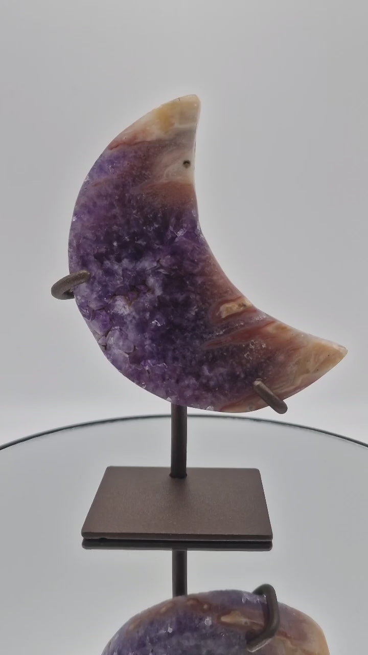 Der Amethyst Achat Mond ist ein einzigartiger Stein mit lila Farbton und starken energetischen Eigenschaften, ideal für die Dekoration oder zur Verbesserung der Energie in jedem Raum. Die roten Linien machen dieses Stück zu einem besonderen Blickfang, während es gleichzeitig eine beruhigende und ausgleichende Atmosphäre schafft. Ein wertvolles Stück für jedes Zuhause.