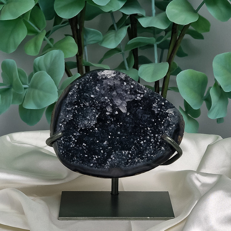 Dieses besondere Stück präsentiert einen natürlich blau-grün schimmernden Quarz aus Uruguay, kunstvoll geschliffen und auf einer schlichten Halterung arrangiert. Die harmonische Mischung aus kühlen Blau- und sanften Grüntönen verleiht dem Quarz eine ruhige, zugleich lebendige Ausstrahlung – ein faszinierendes Farbspiel, das an Meeres- und Waldlandschaften erinnert.