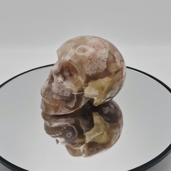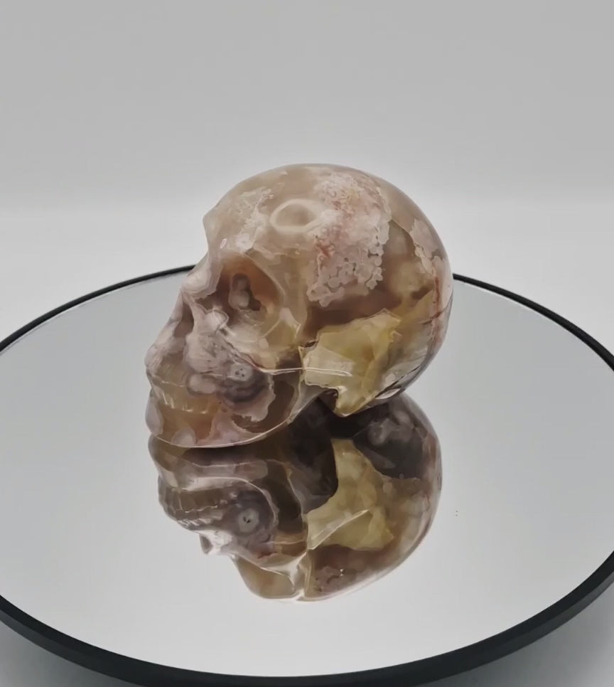 Dieser beeindruckende Blumenachat-Totenkopf vereint die zarte Ästhetik natürlicher Mineralien mit tiefer symbolischer Bedeutung. Das cremefarbene bis hellbraune Gestein zeigt die für Blumenachat typischen blütenartigen Muster und sanften Einschlüsse, die jedem Stück seine unverwechselbare Individualität schenken.