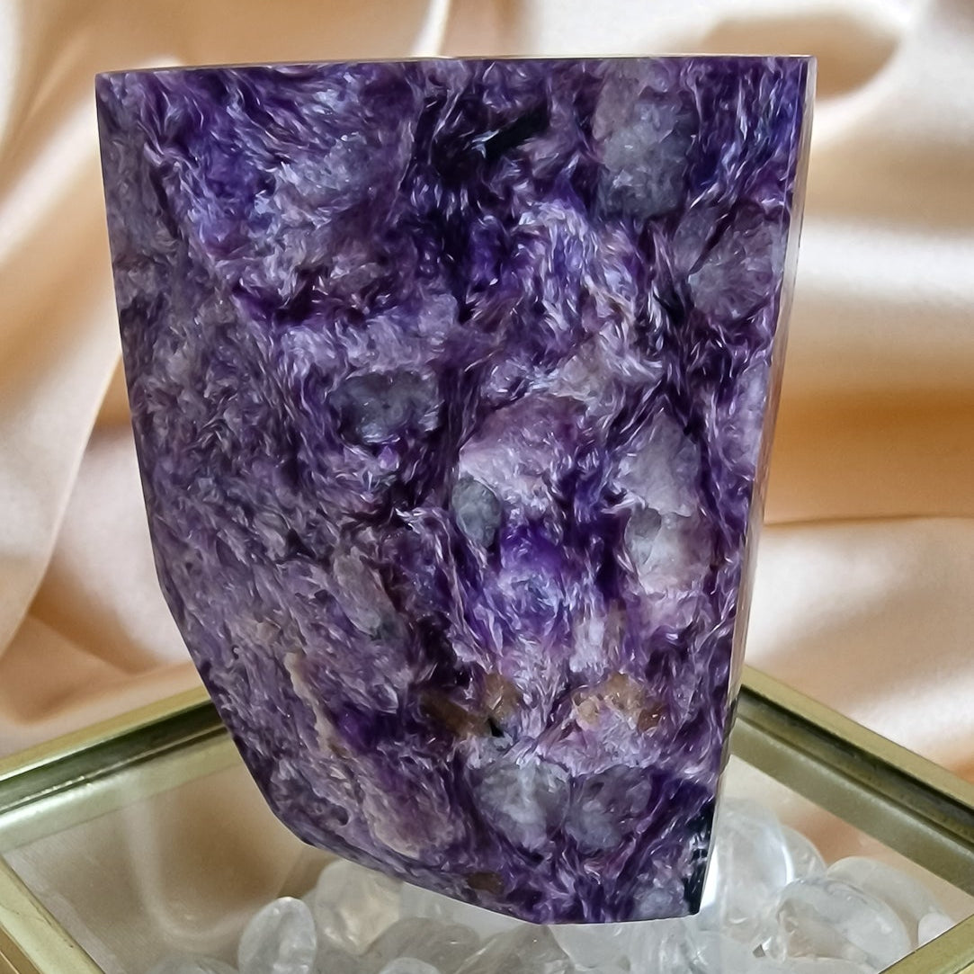 Charoit gilt als kraftvoller Transformationsstein. Ihm wird nachgesagt, Ängste zu lösen, innere Blockaden zu klären und Mut für Veränderungen zu schenken. Er stärkt die Intuition, bringt Klarheit in unruhige Gedanken und öffnet den Weg für spirituelles Wachstum. Ein wahrer Begleiter für alle, die Altes hinter sich lassen und sich voller Vertrauen auf neue Lebenswege einlassen möchten.