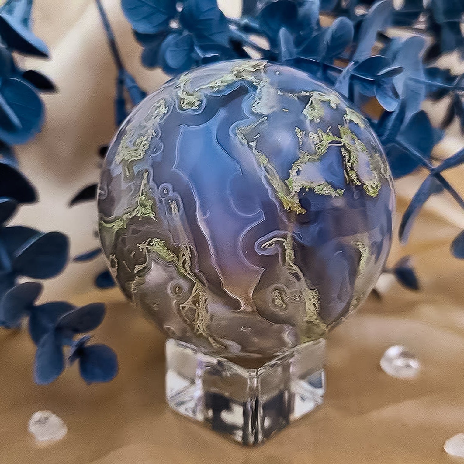 Diese Moosachat-Kugel ist ein wunderschönes Dekorationshighlight, das jedem Raum natürliche Eleganz und beruhigende Energie verleiht. Der Moosachat ist ein faszinierendes Mineral, das durch seine charakteristischen grünen Einschlüsse und filigranen Muster an Moos oder Pflanzen erinnert.
