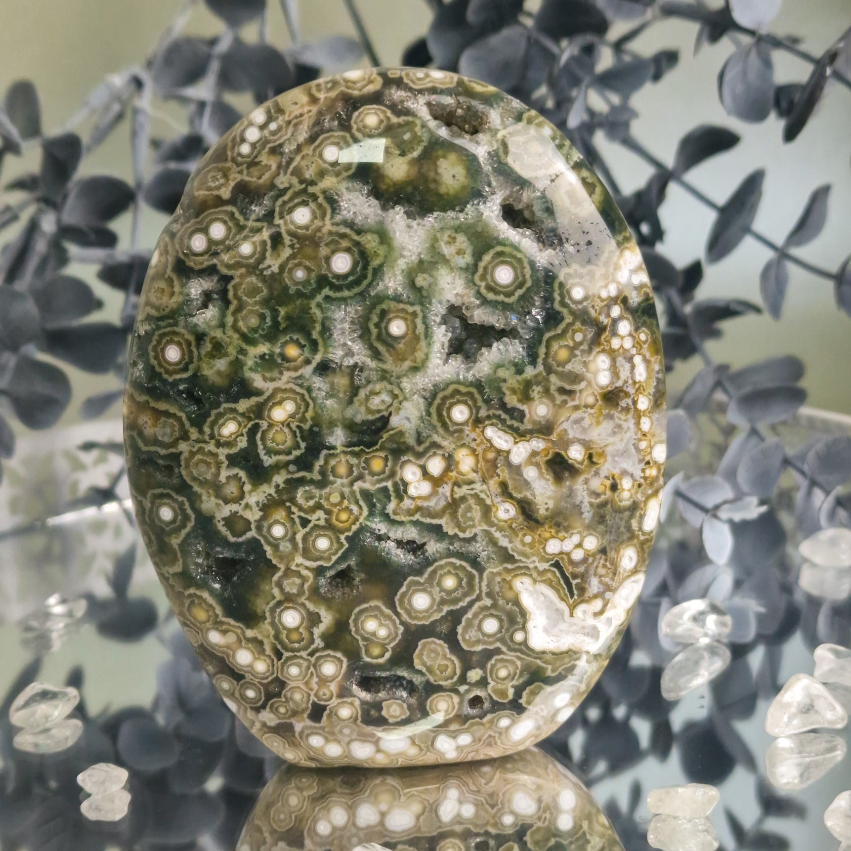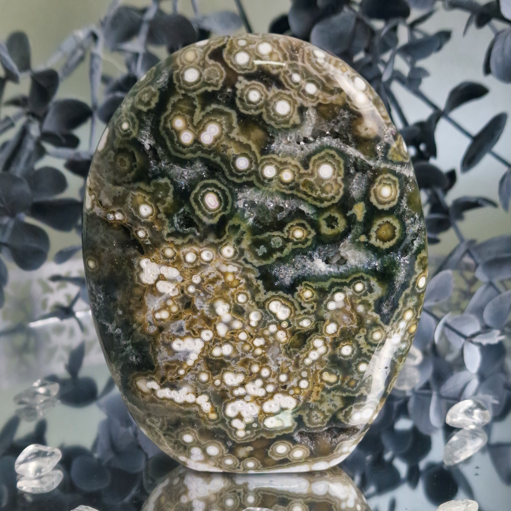 Ocean Jaspis gilt als Stein der Freude, Heilung und Erdung. Er soll dabei helfen, Stress abzubauen, emotionale Balance zu finden und das Herz für Positivität zu öffnen. Seine Muster erinnern an Wellen und Kreise – Symbole für die ständige Bewegung des Lebens und die Verbundenheit mit der Natur.