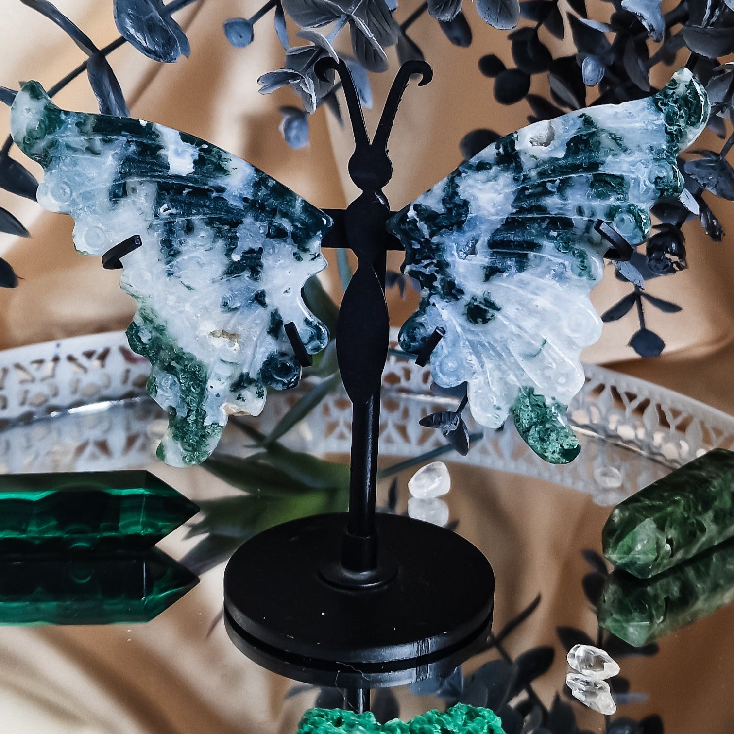 Dieses Moosachat-Schmetterlingsstück auf Halterung ist ein wunderschönes Dekorationshighlight, das jedem Raum natürliche Eleganz und beruhigende Energie verleiht. Der Moosachat ist ein faszinierendes Mineral, das durch seine charakteristischen grünen Einschlüsse und filigranen Muster an Moos oder Pflanzen erinnert.