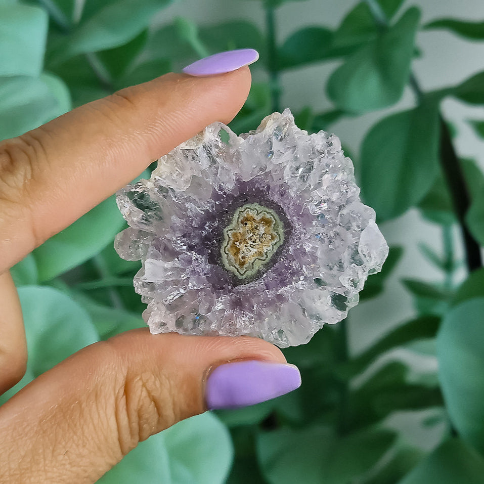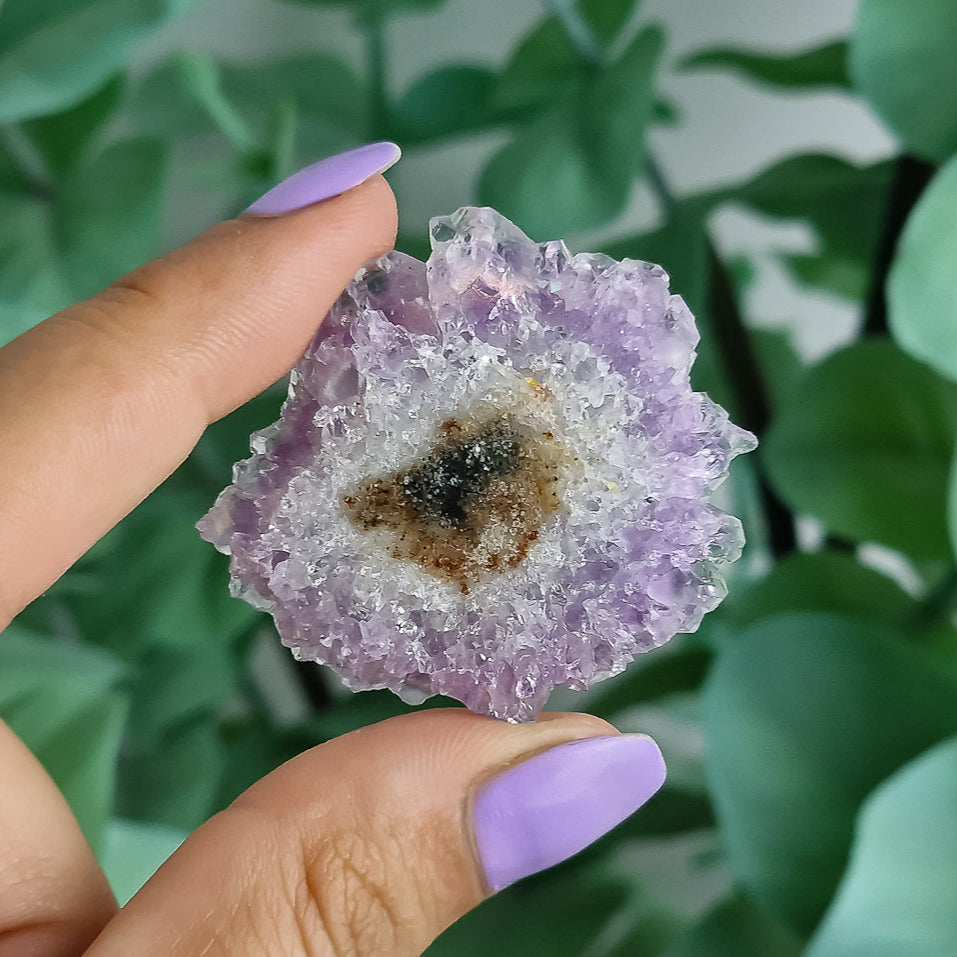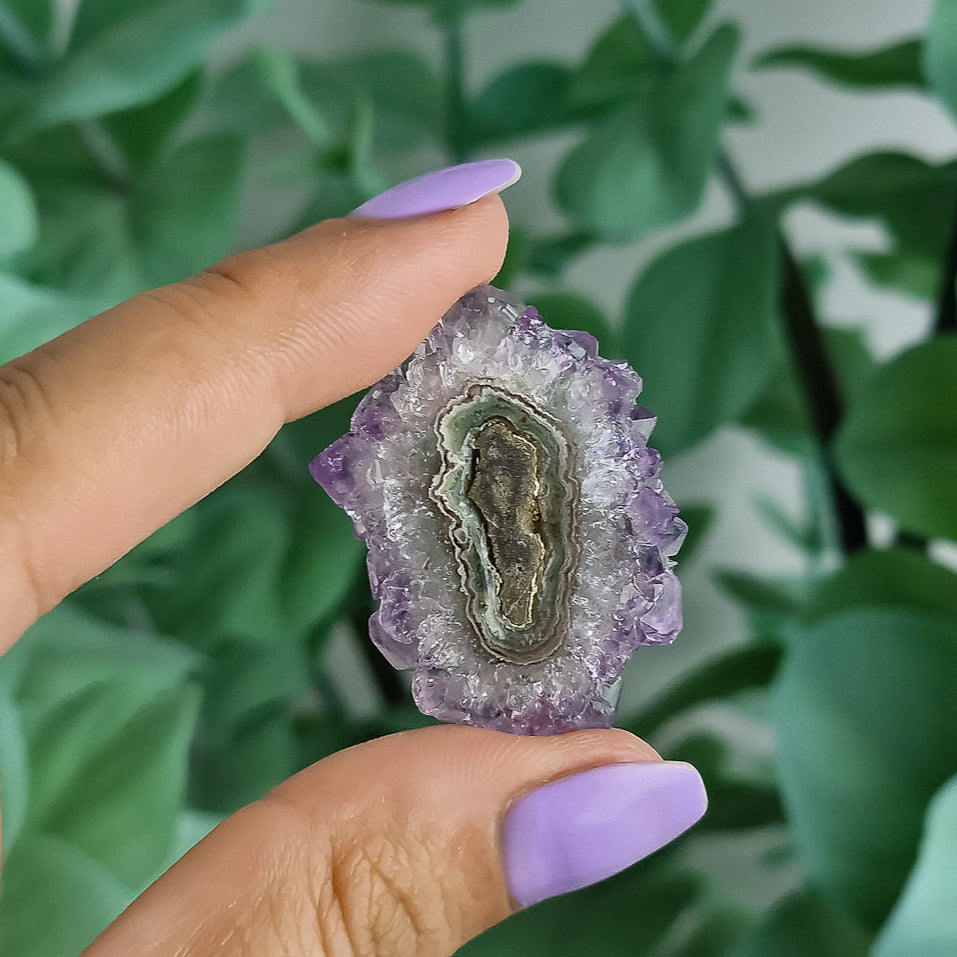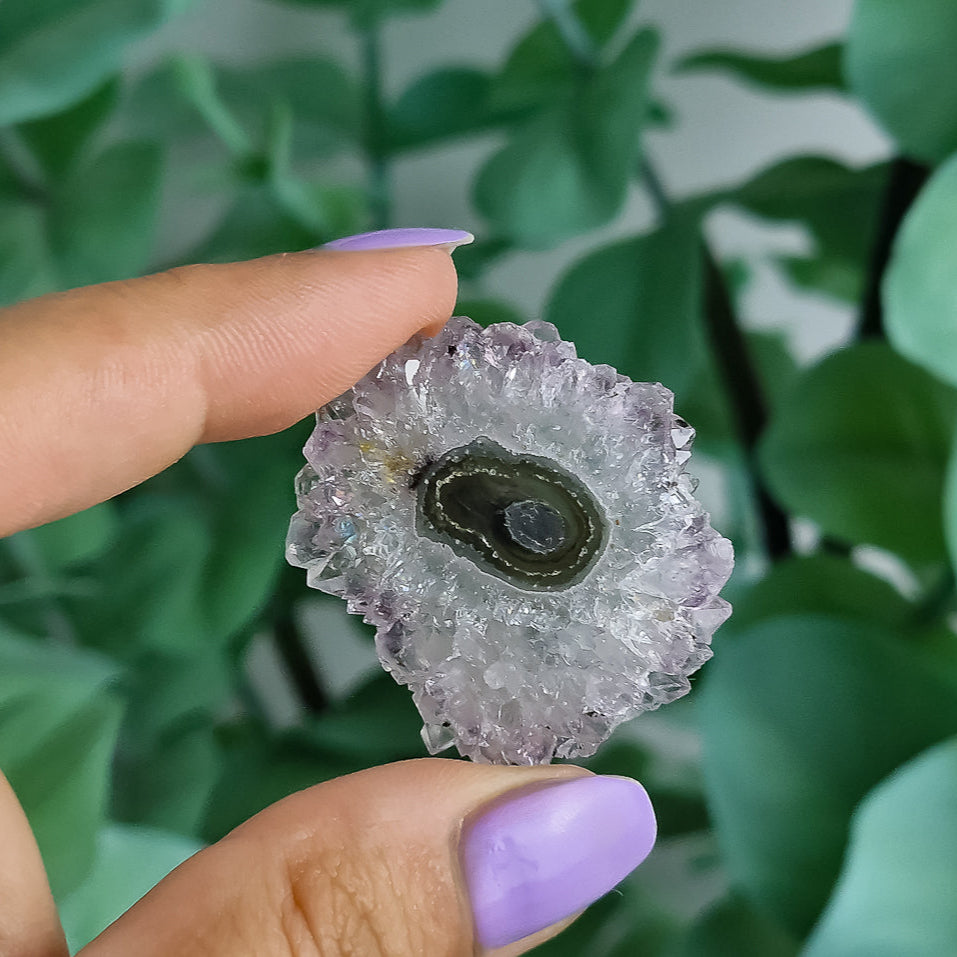 Amethyst Stalaktiten gelten als Steine der Reinigung und Bewusstwerdung. Sie fördern geistige Klarheit, schützen vor negativer Energie und unterstützen die Verbindung zur eigenen Intuition. Durch ihre konzentrische Wachstumsform stehen sie symbolisch für innere Entwicklung, Balance und den Einklang mit der Natur.